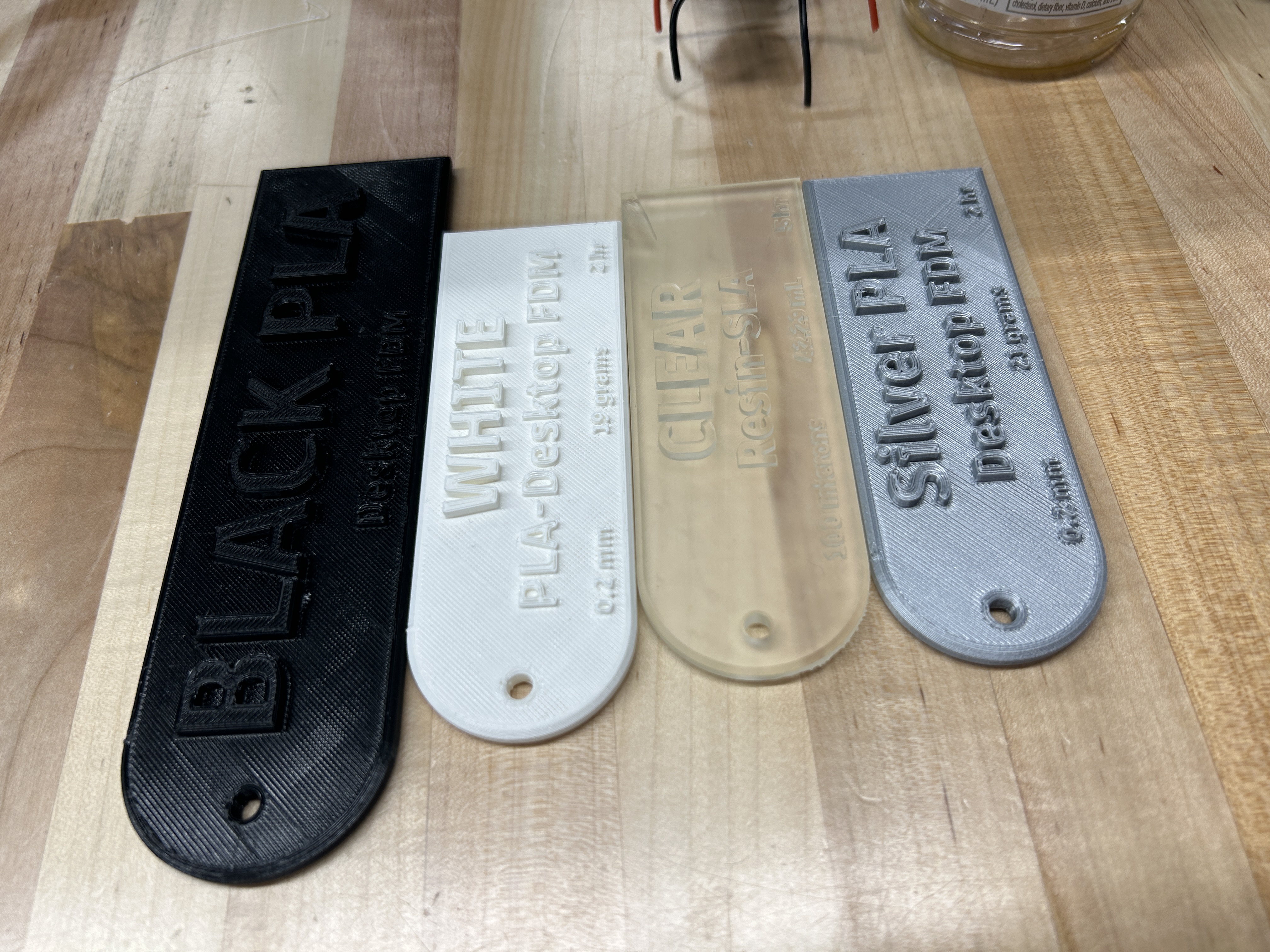 These samples were 3D printed out in every type/color of material the prototyping lab had to offer across SLA, desktop FDM, and industrial FDM printers. With custom details about the printing itself (i.e. printing time and volume of material used), they are meant for educating 1819's visitors on the differences between printing types.