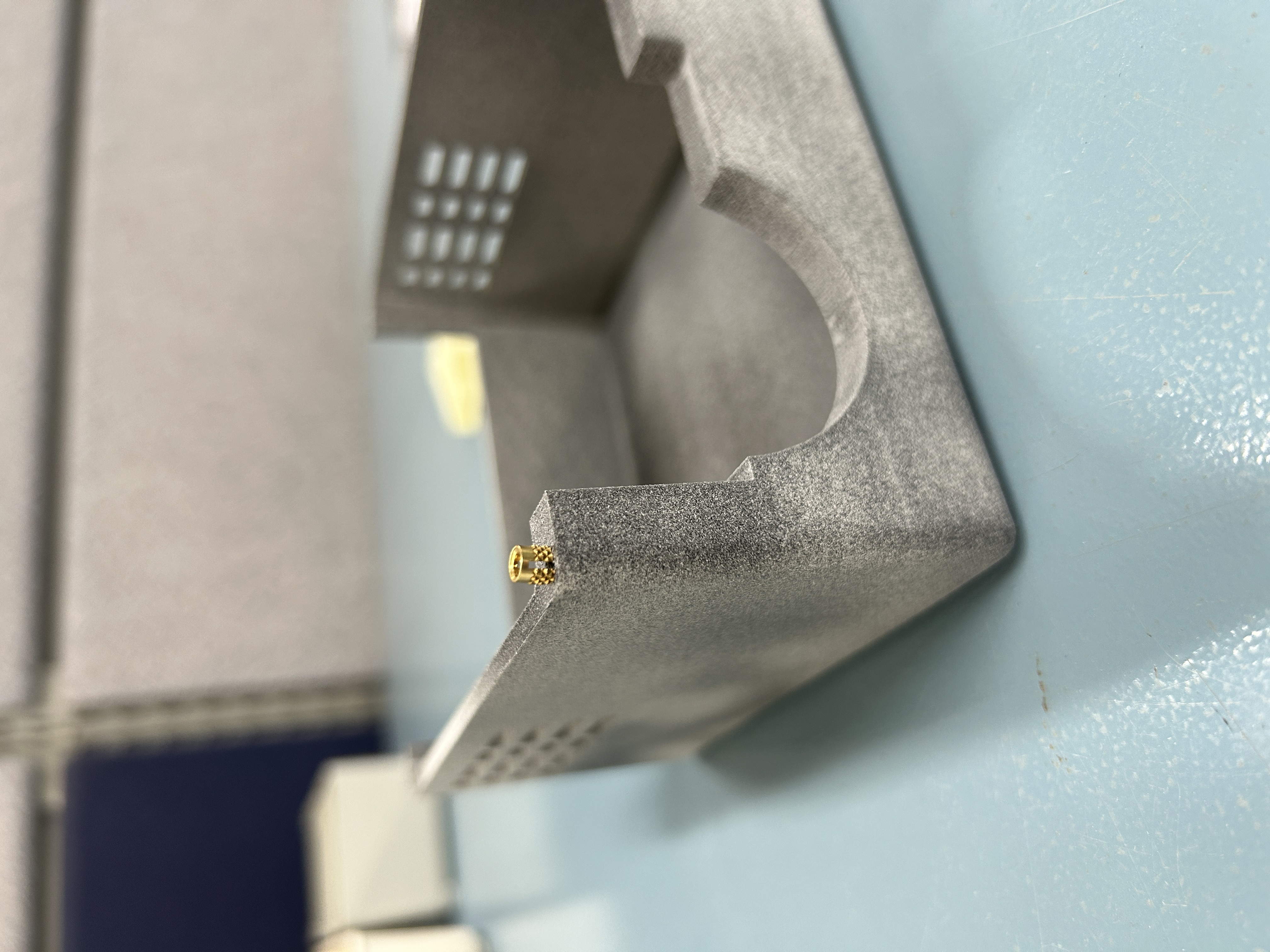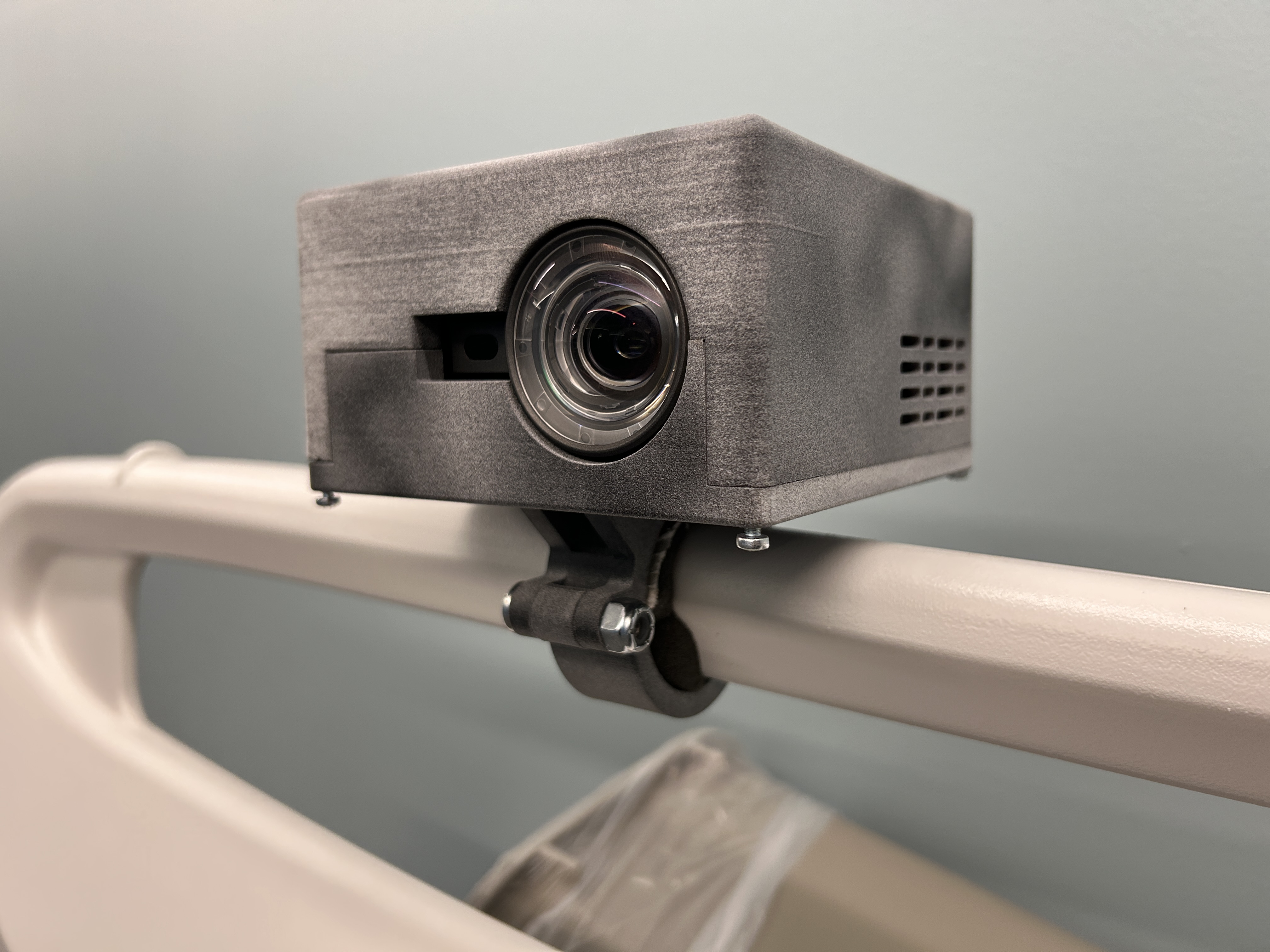 I CAD modeled this footboard-mountable case for a projector to be used in a demonstration. The hinge can be tightened by hand with a wing nut in order to easily adjust and hold the projector at an angle. It was powder 3D printed (PBF) by an in-house model shop and inlaid with threaded inserts.